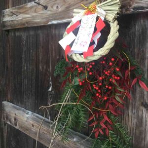 「あけましておめでとう」スワッグポスト脇で活躍してもらっています。全部入り切っていませんが。おだやかな年になりますように!