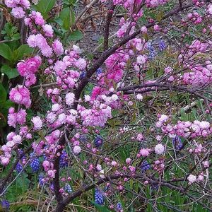 3/28㈰⑥🌸追記あり🌸 菊桃 キクモモですか? 私が知っている菊桃はもっと花びらが開いているのですが…😅 昨日の源平咲き枝垂れ花桃の近くに咲いていました😃根本にムスカリが咲いていて綺麗なコラボでした。 🌸追記🌸 ニワザクラでした💡 回答してくださった皆さんありがとうございます🙏初めて出会いました😄 わかってスッキリしました🌸🌸🌸