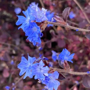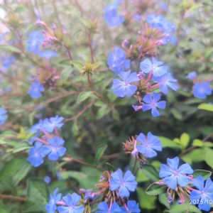 水曜日は水色🩵 一枚目はルリマツリモドキ(セラトスティグマ プルンバギノイデス)、二枚目はブータンルリマツリ(セラトスティグマ グリフィティー)です。同じセラトスティグマ(ケラトスティグマCeratostigma)属で、お花は良く似ていますが、ルリマツリモドキ(C.plumbaginoides)は宿根草で背丈低く横に広がるのに対して、ブータンルリマツリ(C.gliffthii)は低木で、落葉樹なのが異なります。 花付きはルリマツリモドキの方が良く花壇などに使いやすいので流通はこちらの方が多いそうですが名前が混同されてブータンルリマツリの名前で売られている事があり、本当のブータンルリマツリをやっと見つけて買えたのが嬉しかったです😊 野趣のある木姿が気に入りました🎶
