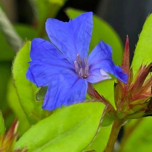 ブータンルリマツリ(セラトスティグマ・グリフィチー)です💜💙 よく似た仲間のルリマツリモドキ(セラトスティグマ・プルンバギノイデス)はグランドカバーになるような丈低く横に広がる宿根草ですが、ブータンルリマツリは低木で背丈が40〜130cm位まで伸びます。 夏から晩秋迄澄んだブルーの花を咲かせてくれるというので欲しいと思っていましたが、ルリマツリモドキと混同されている事も多くて、今回はっきりブータンルリマツリと分かるものをゲット出来て嬉しいです☺️ まだ苗なのですが、お花も付いていて、可愛い青いお花です😍💙🩵💜