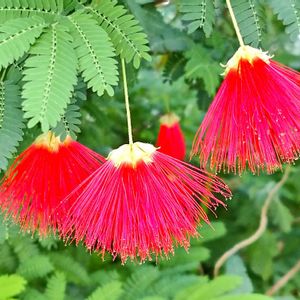 今日も暑かった~😵 8月より紫外線が強い❓💧 こちらはネムノキに似ている真っ赤な🌼…亜熱帯地域が原産です。 高さ1.5mほどの樹に100個ほど花がついてました😲 下を向いて咲いてるので違いがわかります👌😊 (別名:ヒネム)