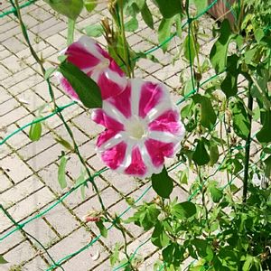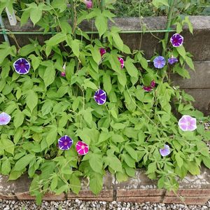 投稿が遅いですが、今年の朝顔です。種まきを今年は行っていませんが、昨年のこぼれ種でこうなりました。 曜白の混合です。ピンク、赤、青、薄い青などの色の花が咲きます。種を見ても判りません。花弁が厚く、午後でも咲いていることもあります。