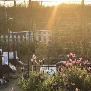 かぼちゃの栗坊、本日二投目❗️ 庭の真ん中で思いっきり 大きくなあれ♡ ※どんな棚にしたのか、リクエストがあったので。 この編みの所に可愛いかぼちゃ🎃がぶら下がるはず⁉︎