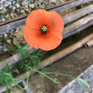 お隣との境界にこんな可憐なお花を見つけました。 貴女のお名前は❓ ポピーかな? あってますか? ナガミヒナゲシと、教えて頂きました。 花と虫と風と空とさん、Flugel さん、ありがとうございました。