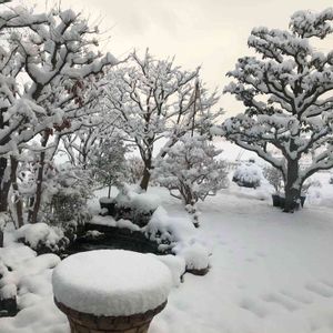 今季初の積雪です❄️ 裏庭の冬景色💕 寒いのは苦手ですけど、いいなあ❣️ 福寿草の花が開きそうだったけど、時間が止まったね🤗