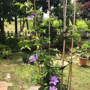 🎶 クレマチス ♫ このお方も3年目です😆 蔓が伸びて今年が一番美しい姿かな〰と思っていたのに、花びらが😂、誰かさんが食べてる( ꐦ ・᷅ὢ・᷄ ) シュー☆(※ơωơ)つ鹵~<巛巛巛してもあまり効かない⤵