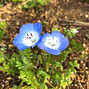 🎶 ネモフィラ・マクラータ ♬ 昨年はブルーフラワーガーデンだった花壇にマクラータを発見💓٩(。˃ ᵕ ˂ )وイェーィ♪ 忘れな草もこぼれ種で、だいぶ前から咲いています。 今日は午後から雨☔で忘れな草に守られているかのようでした。