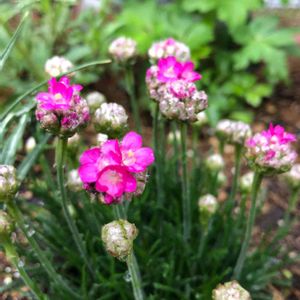 🎶 アルメリア ♬ 2年前、100円の見切り品で買ったアルメリア🥰今年も咲きました🎶 まだ、蕾の方が多いですが、雨に打たれて光ってます~ෆ( ´͈ ᗨ `͈ )◞♡⃛💓