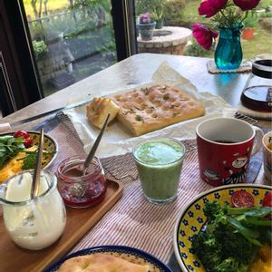(美味しい部) 🎶 フォカッチャ ♬ 今朝はフォカッチャで〰す𐩢˒˒😋ྀི ŧ‹"ŧ‹" シェフのコメント「ローズマリー、のっけるの、忘れた〰😅後付〰💦」 「美味しいっス〰〰〰💓」ワタシ(*ˊᗜˋ*) 𓌉◯𓇋メニュー ・野菜スープ ・プレート(オムレツ、🍅、🥦、クレソン) ・スムージー(小松菜、🍎、🍌) ・☕ 🌿畑のお花 お花の名前を教えて下さい🙇♀
