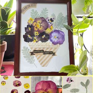 職場の後輩のお祝いに、押し花フレームをプレゼント🎀しました❣️ 先日は、アイアンフレームで作ってみましたが、今回は後輩の雰囲気に合わせて、ウッドフレーム&リース風デザインに☺️ ぜーんぶバルコニーで育てたお花で作れたのがとっても嬉しいです♪♪ 末永くお幸せに❤️ *ビオラ色々 *フリルパンジー *プリムラジュリアンゼブラ *アンティークペチュニア *シルバーレース *ユーカリポポラス