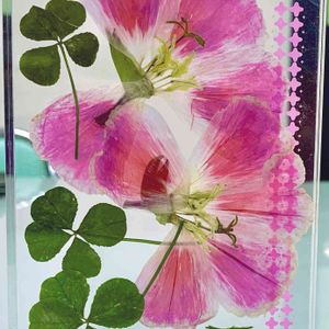 ゴデチアと四つ葉のクローバー。🍀 押し花をして。写真立てに飾りました。🌸