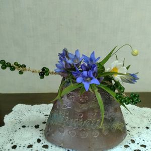 今日の庭から 庭の花を生ける✊ リンドウ、ヤブランの実、 シュウメイギク 花器は益子焼きです