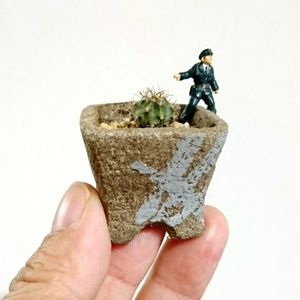 種から育てたサボテンです😊 やっとこの大きさです🌵 ※警備員は育てていません。 鉢はオーブン粘度で作りました🎶