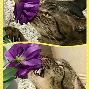 お庭警備員 コテツ 🐱スンスン クンクン・・・ 🐱「トルコキキョウに異常無しであります👮」 いつも ありがとうね コテツくん~💕 ガブッ!! カジカジ!! って え~~っ💦!! 後ろ向いてるすきに 白目剥いて噛みついてるじゃん! (||゚Д゚)ヒィィィ! 異常無しは 噛める!だったのかい・・・ ( ̄▽ ̄*) ・・・ァハハ また猫に騙されちまった~💧