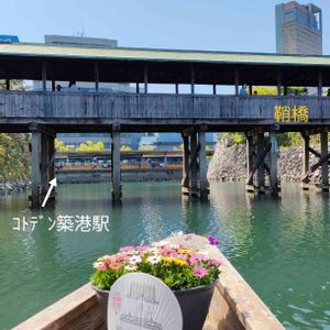 天守閣と二の丸をつなぐ鞘橋(さやばし) のむこうにウクライナカラーの🟦🟨 コトデンがホームに入ってきました 一日二回なのでラッキーです🤗 🏷️ウクライナに平和を コトデン高松築港駅 琴平線のホームからもお城のお堀がみえて鯛が 泳いでいるのが見えますよ🐠