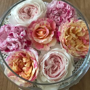 ボタンも咲いてから3日目なので一輪カットしてフローティングベースに。 ボタンは花瓶に活けたらパラパラと散ってしまいますが、こうして置いたらドライフラワー的になりますが長く楽しめます。 まだ開ききってないですが、エデゥアールマネとオデュッセイアも。 豪華や〜。