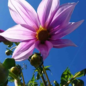 こんにちは😄… 庭の皇帝ダリアさんです😋 背景の咲いてる子は八重咲きで 手前の蕾は 越冬してくれた一重の背丈4㍍の巨大 ダリアさんです🤗💕 咲くのが待ち遠しい…🤤♪