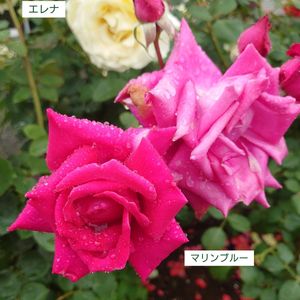 5/20㈯③ mimozaさん発信 🏷0の付く日は雨粒の日 先週の土曜日。雨の中、向ヶ丘遊園の遊歩道五ヶ村堀緑地を歩きながら薔薇を楽しみました。 殆どは毎年咲く場所に咲いていた中で、今年初めて出会った薔薇マリンブルー。 交配親は、青薔薇マダムヴィオレ×赤い薔薇コロラマ。 明るいローズピンクですが、ブルーの要素を引き継いでいるので、マリンブルーというネーミング。 青薔薇とは思えない色ですよね!! 秋は紫ピンクになるのか、調べても詳しいことがあまり載っていませんでした。 まだ新しい薔薇のようです。
