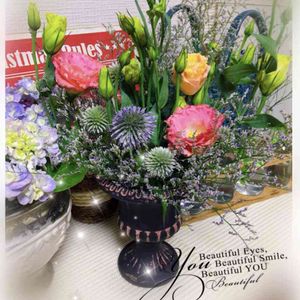 おはようございます🌼🌿 ルリタマアザミさんにトルコさん加えて… 可愛くなりました💕 少し賑やかすぎかな(笑) コーラルピンクとオレンジの間のような少し隠れてるトルコさん美人ですよぉ~💖
