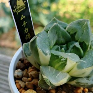今まで置いていた場所に太陽が当たらなくなってきたので、場所を検討。 でも、その場所はハオルチアでいいかも…。 ムチカ錦。 冬にお迎えしたのが、ようやく開いてカッコよくなってきました。 しかし、最近「もっとよく選ぶべきだった…」と思っています。 「同じ価格なら、小さくて斑が多いものより、斑がちょっと少なめでもサイズが大きいものを」と思ってこの株を選びました。 今は「小さくても斑が多いものを選ぶ」の方です😅 成長点が斑なしになりそうな予感💦 そして、斑入りの窓が美しい✨ かなり大きくなったので、子株が出てくれることを期待。 2枚目、フレーヌ✕チワワエンシスジェコラ(左)、エレイン✕ラウレンシス(右)。 フレーヌ✕チワワエンシスジェコラは、THE FACTORYさんの苗をイベントで1年前の5月に購入。 かなり大きくなってきました😌 元々はミソップさんの「さくらホイップ」が欲しかったのですが、買えなかったのでこちらをお迎え。 今はこちらで十分満足しています👍️ 葉挿しが出るようなので、いつか取りたいと思います。 エレイン✕ラウレンシスは、フリマアプリで。 ラウレンシス好きなので思わずポチりました😁 しばらくぐらついてましたが、ようやくガッチリと。 どれくらい青く染まるか楽しみです✨ ちなみに、フレーヌとエレインは同じものです。
