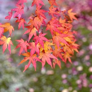 【石、モミジ、青モミジ】 皇帝ダリア&皇帝ヒマワリの咲くお寺に再度 紅葉を見に行った時のpicですが 初めて石が並んでいる事に気づいて📸 青モミジもまだ有って、赤くなったモミジの奥に、この石たちが覗いていて誘われました😊