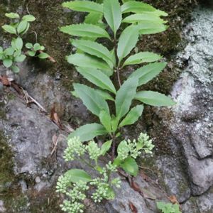 ミツバベンケイソウ ベンケイソウ科 ムラサキベンケイソウ属 葉っぱはふつう3輪生だが、4輪生. 対生、互生まで変異があり.長さ3~8cmの楕円形。全縁または鈍鋸歯がある。 花は茎頂に複散房状に多数付き、花弁は白緑色~淡黄色。花弁は、5枚。