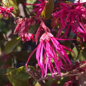 お彼岸ですね。 昨日はお墓参りに… お寺のお庭に咲いていた ベニバナトキワマンサク 近くで じっくりと見たのははじめて❣️ 細い花びらが1枚1枚 リボンが巻かれたような蕾に びっくり🤭 花言葉 「私から愛したい」 「霊感」「おまじない」