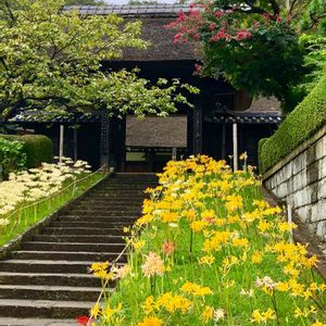 同じお寺のお庭から… 鶴と馬の置物に ヒガンバナとコルチカム