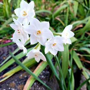 朝活散歩道🚶♀️にて… 道端に白いスイセン咲いてました。 1株だけでしたが清楚かつ凛としてました。 房咲水仙・ぺーパーホワイト (調べたら香りは良くない🚻のような…😆)