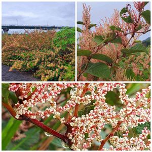 朝活散歩道で… (俳句) 川のふちほのかに浮かぶ明月草 お粗末(^.^)(-.-)(__)様で…字あまり😆 ☂️も降りだし最短コースを歩いていると⁉️ 遠く離れた川岸一帯が淡いピンク色で…ボワァ~っと浮かんで見えました。 近眼の私👓忘れてかけずに来て… 近くに行くと(イタドリ)の紅花?実(・_・?) 群生していました。 イタドリの花は白が多く マレに淡紅色が見られ紅花のイタドリはベニイタドリ、 明月草と呼ばれるそうです。 今夜😃🌃は🌕 月明かりに照らされた明月草、視てみたいけど台風🍃🌀☔心配です。