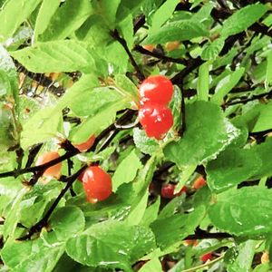 朝活散歩道🚶♀️にて… 緑の山肌に…綺麗な赤い実🙌🎶 確か(・_・?)春先 白い花💠ユスラウメ❗ 子供👧の頃…田舎で食べたよね🎵 高い場所で…✋が やっとこさ3個😋 何とも甘酸っぱく…懐かしい味 美味しゅうございました。