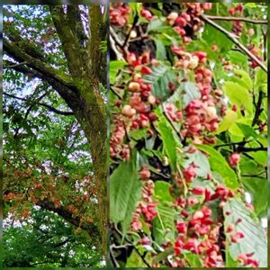 先日、投稿した…木ですが 大きな木に美しい赤色、黄緑の細かい花💠実(・_・?) 今朝…のpicです。 私なりに🔍️👓️ました。 (ハルニレハフクロフシ) オカボノクロアブラムシの虫エイ(虫コブ) だと思います。 間違ってたら…ご指摘お願いします。 🌿樹皮からハルニレの木としました。 6月頃、赤い虫コブは夏になると茶色くなる。 とっても綺麗✨💕なのにビックリ👀😱😣 どんだけの虫が… この木は大丈夫なのでしょうか?