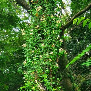 朝活散歩道🚶♀️にて… ティカズラ キョウチクトウ科 常緑つる性木 花期…5~6月 花言葉…依存、優美な美人 太い木に白い花💠が絡んで上へ上へと花💠を咲かせてました✨