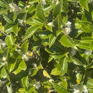 1〜3 ヤバネヒイラギモチ(矢羽柊黐) モチノキ科モチノキ属雌雄異株 朝鮮、中国原産 帰化種 別名 シナヒイラギ 先日、横浜こども植物園で会いました。 金魚椿の葉のように個性的な葉、こちらは矢羽の形ですが、古くなり丸くなっている葉もありました。紅い実がなる時期はクリスマスホーリー(セイヨウヒイラギ)と同じ冬のようです。 4、5 ヒイラギモクセイ(柊木犀) モクセイ科モクセイ属 雌雄異株 ヒイラギとギンモクセイの交雑種 常緑小高木 花期は10月 微かに芳香のある白花で4深裂し、 径は8〜10㍉ キンモクセイ、ギンモクセイと同様、雄株雄花しか日本には無く結実はしない。 野鳥公園には名札が付いていていますが私はギンモクセイと混同してしまいます。 昨日の野鳥公園で撮影しました。 以下、野鳥公園(長浜公園)ブログより引用します。 葉の違い 「柊」尖った葉と丸味のある葉がある 「銀木犀」葉のギザギザはノコギリ状で棘が小さ目触ると多少チクチク感あり 「柊木犀」葉の縁は鋭く尖った棘 まるでノコギリ歯、触ると痛い