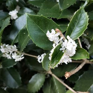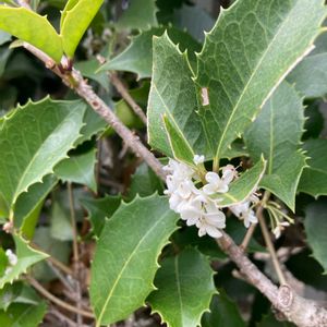 日陰の植え込みで咲く白い花。 ギンモクセイかと期待したのですが、葉っぱにトゲトゲらしきものがあるのでヒイラギモクセイだと思います。 以前に投稿したクリーム色のウスギモクセイと違って、花は真っ白でした❣️
