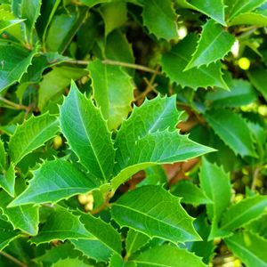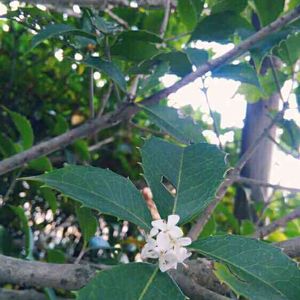 🌳🌳🌳🌳🌳🌳🌳🌳 【ヒイラギモクセイ】 モクセイ科の常緑樹、🌳ギンモクセイとヒイラギの交雑種で、日本では雄株が中心であるため自生は有りません、下枝が枯れにくく、管理もしやすいため、防犯も兼ねて住宅やマンションの垣根に用いられるています、葉の大きさはキンモクセイ程度ですが、ヒイラギのように縁にはトゲがある触ってもヒイラギほどは痛くありませんよ、そして白い花には芳香があります。👍🌳🌳🌳🌳🌳🌳