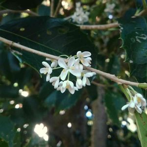 多分、柊木犀だど思う(*^^*) 柊の葉っぱに白い小さなお花✨ 近づくといい香りがします:.* でも葉っぱは柊でトゲトゲがあります。