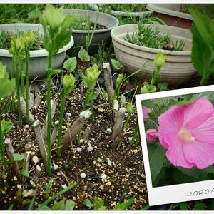 芙蓉 ふよう アスパラのように成長してます‼️夏には↘️右下のような花が咲きます🙋 我が家の夏花の主役さんですね☺️