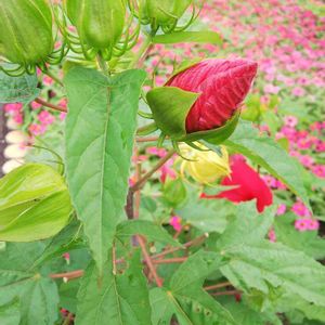 おはようございます☀️🙋❗️ * 近所の遊歩道に大きな見事な花が咲いてました~❤️芙蓉かな? 蕾の方が好みだったので、パチリ~🎵 背景はポーチュラカです🎵