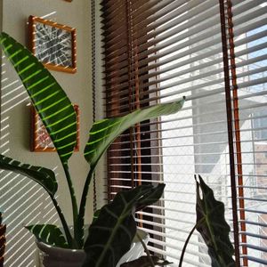 今日は陽射しが暖かいのに、🍃が… お部屋のストレリチアさん、ブラインドの線が入ってカラテアみたい😁🌱🌿
