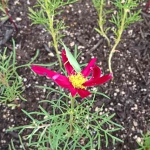 おはようございます✴️ 今日はいつもより涼しい朝です☀️☁️ 今月はじめに種を蒔いて、今日初めて咲いたミニコスモスさん💠 なんか花が不恰好だなあと思ったら、犯人発見‼️👀 花びらを食べたのは君かぁ⁉️