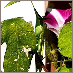 今日の朝顔 ひと休み 今日は朝顔が 昨夜からの暴風雨で お花が全滅でした 過去のpicです バッタさんが一匹います 朝顔の蕾と葉を食べて大きくなりました 蕾を食べられても咲いた朝顔 生きるための自然界をみました (三色十七輪)