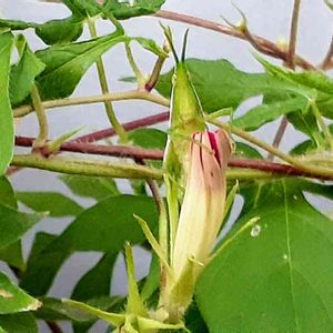 朝顔のつぼみが開きそうです バッタさん おはよう!