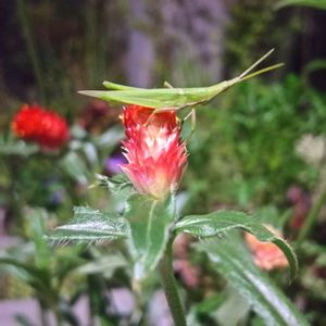 バッタくん 千日紅の葉を食べたみたい👀 夜の食事中だったかな😋