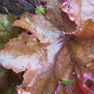 庭Bのヒューケラ、よく見るとバッタの赤ちゃんがお食事中。