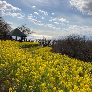 お出かけ写真です。 神奈川県吾妻山公園🎶 1月の下旬ごろ。 菜の花と相模湾がとても綺麗に見渡せます。 お天気がよければ反対側に富士山が🗻見えるのですがこの日は雲隠れでした。