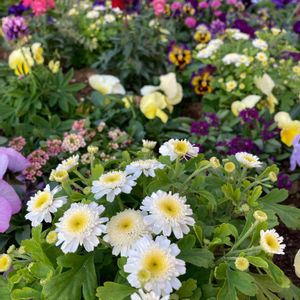 公園の花壇、にぎやかに植えられてます🎶 マトリカリアとても可愛いお花です💕 花言葉「集う喜び」