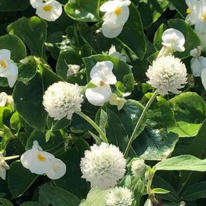 今日のお花✨ 千日紅💕 公園をお散歩にて🎶 千日紅咲いてないかなぁとキョロキョロ 白い千日紅と白いベゴニア💕 可愛く咲いていました。 品川中央公園にて🎶