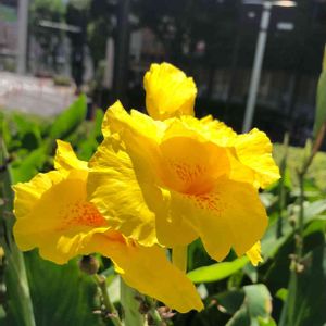 今日のお花 カンナ✨ 久しぶりの青空、光をいっぱいあびて✨ 輝いて見えます🎶 駅前のロータリーの花壇にて☀️