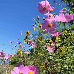 今日のお花🌸 コスモス💕 青空に誘われて、運河をお散歩🎶 コスモスと向日葵✨可愛いです。 とても風が強くて、 コスモスがゆらゆらゆれるところも良いです。 これからコスモスの季節ですね💕 一面のコスモス畑を見に、今年は行けるといいなぁと思ってます🎶 昨日撮影しました🎶
